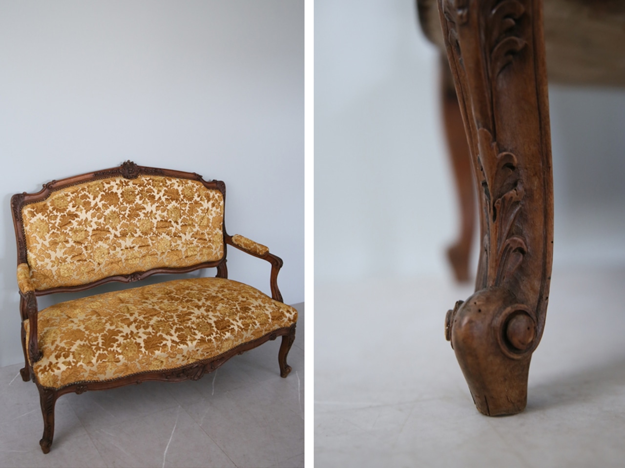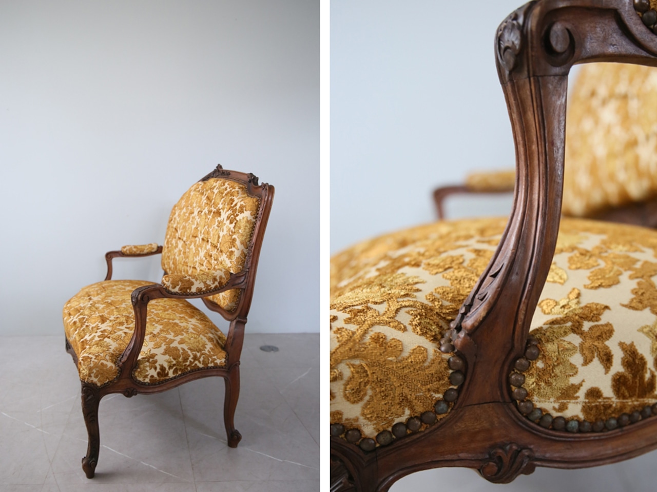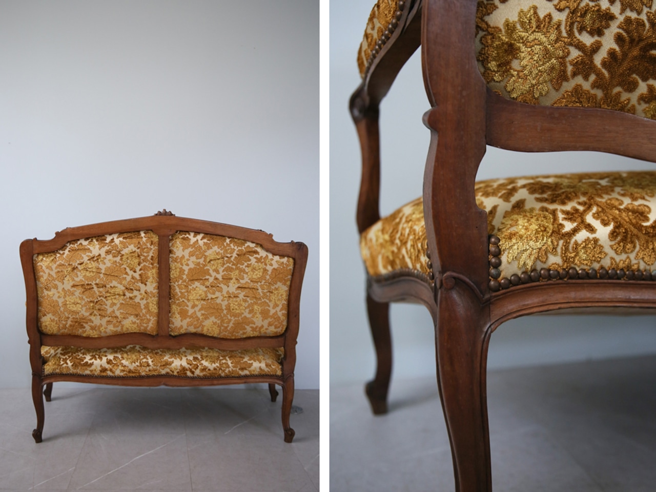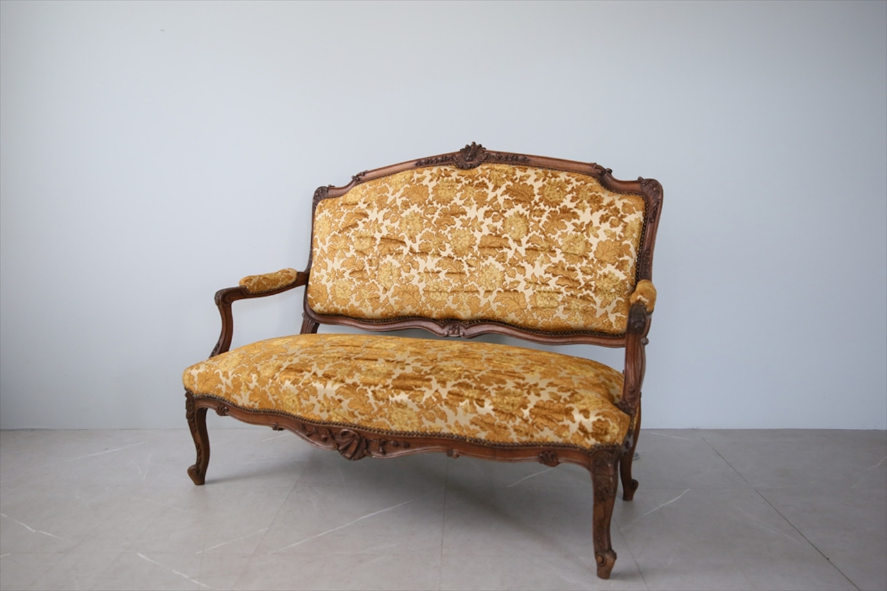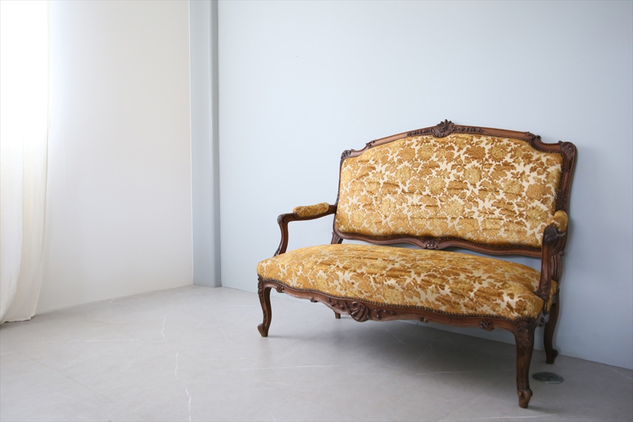 リメイク品のフレンチソファとは異なり本物だけが放てる重厚な存在感が魅力の一品。豪華なドレスを着飾った貴族達のいる宮殿にやって来たかのような存在感のある佇まい。見ているだけで時間を忘れうっとりしてしまいます。