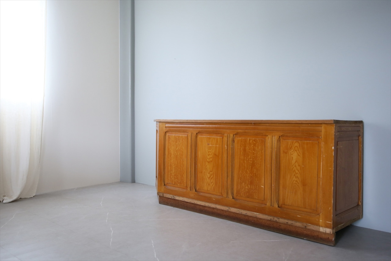 古い木製カウンターはショップでのカウンターとしてはもちろん、キッチンカウンターとしてや、店舗でのディスプレイテーブルとしても活躍してくれそうです。ご自宅のアクセントとしてはもちろん、店舗什器としてもぴったりな一品です。