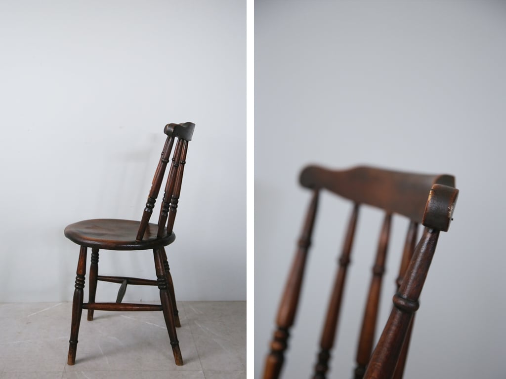 アンティークのイスの中でも特に人気なのがこちらのタイプのキッチンチェアで、もともとはキッチンやファームハウスなどの作業をするための場所で使われていたイスです。言うなれば作業用のイスですね。