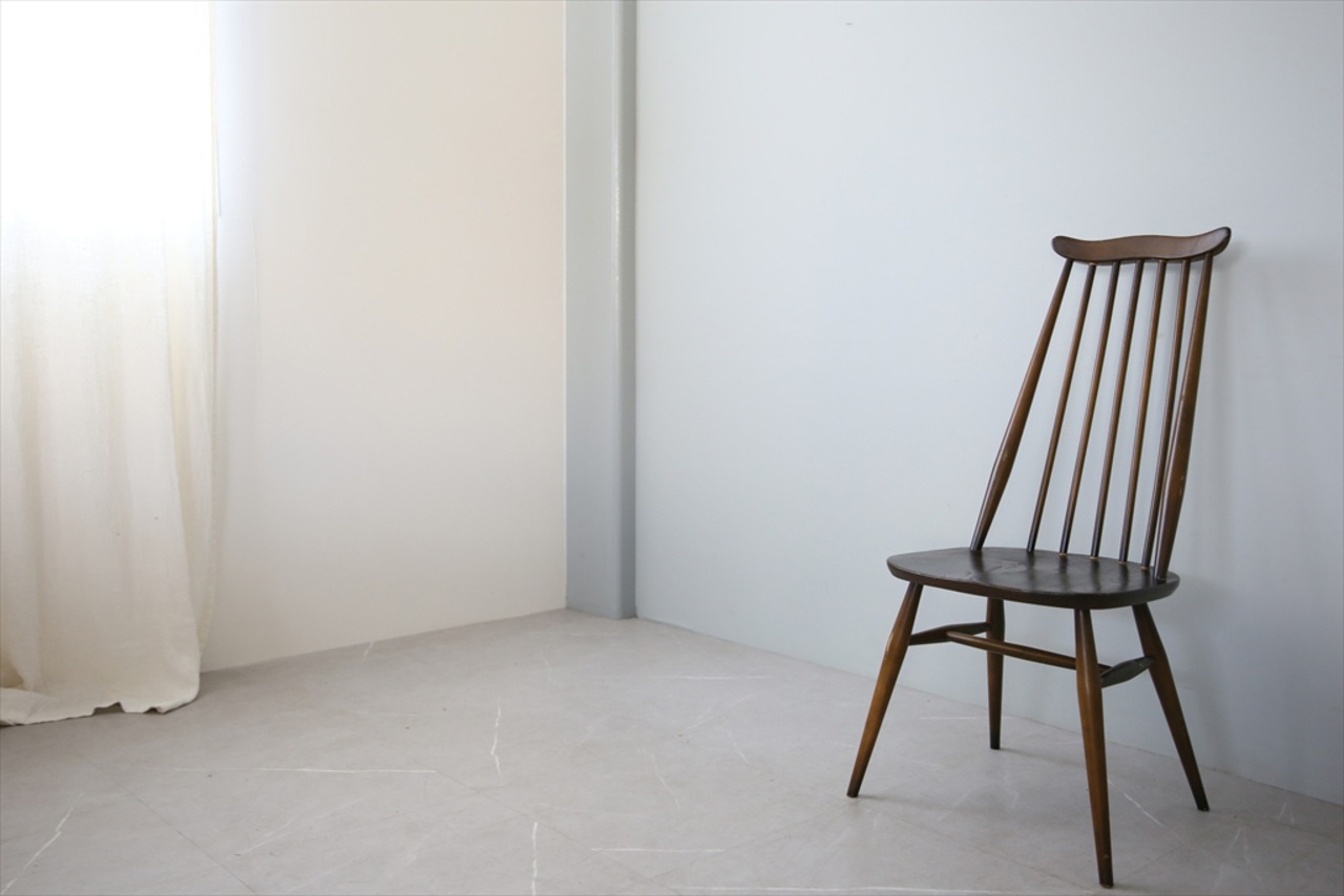 背もたれのトップに優雅なカーブを描いた王冠のような飾り木がゴールドスミスの特徴。シンプルながらオシャレな存在感を放つゴールドスミスチェアなので、ここに座って珈琲を飲みながら読書・・・なんとも贅沢な時間ですね。