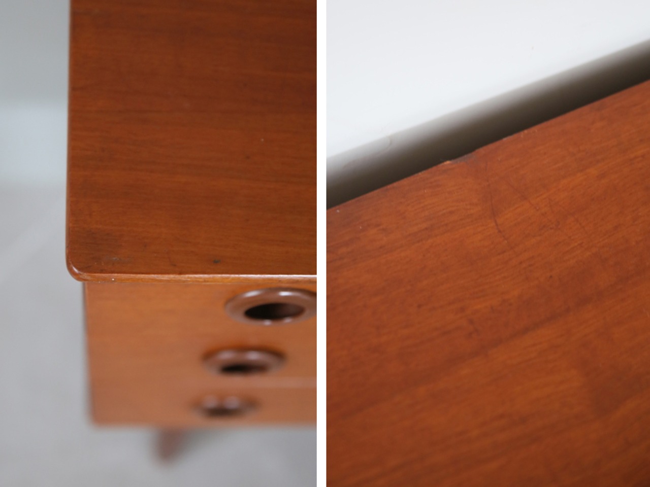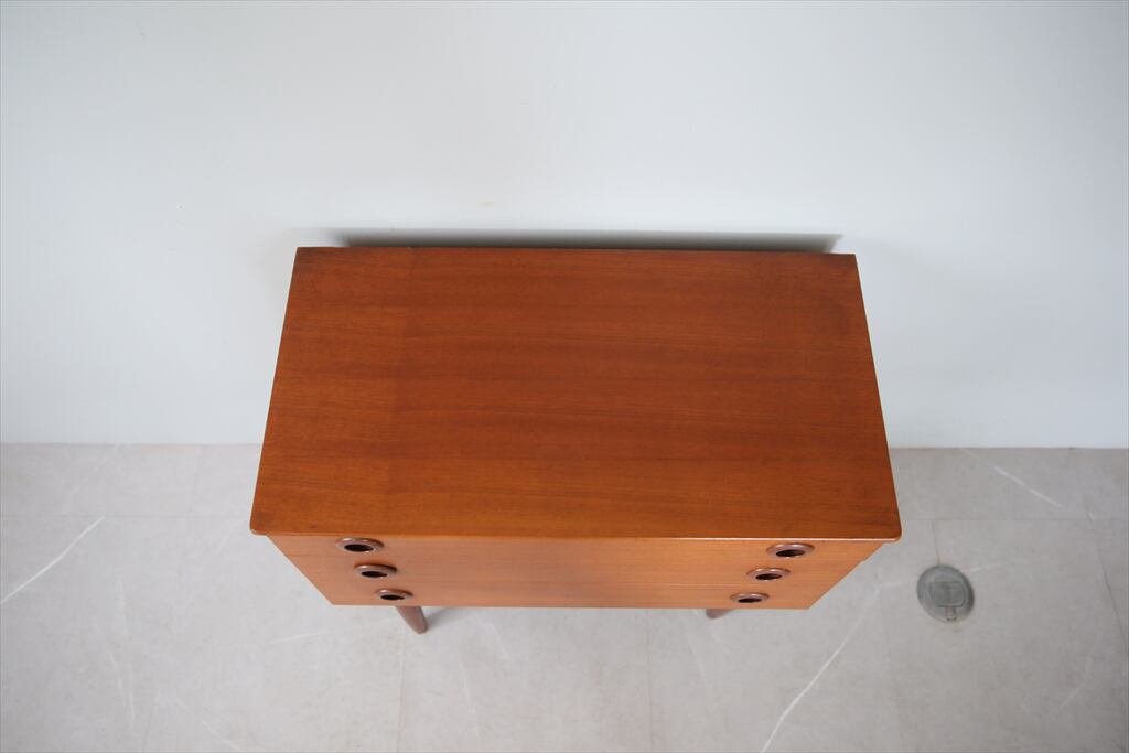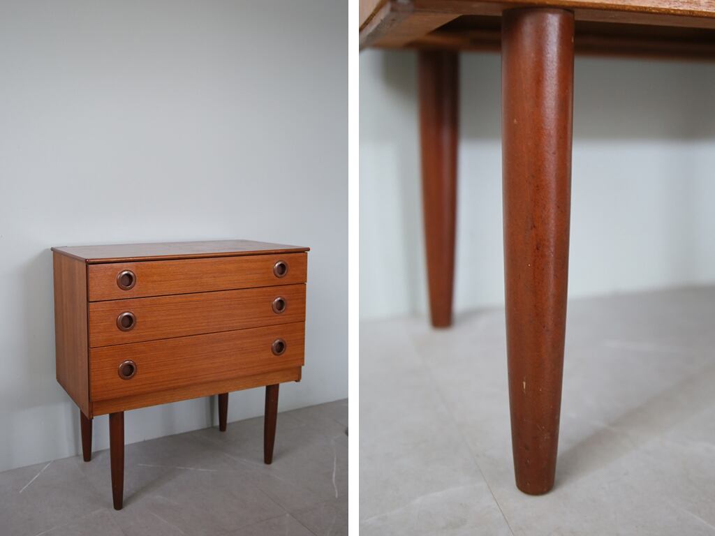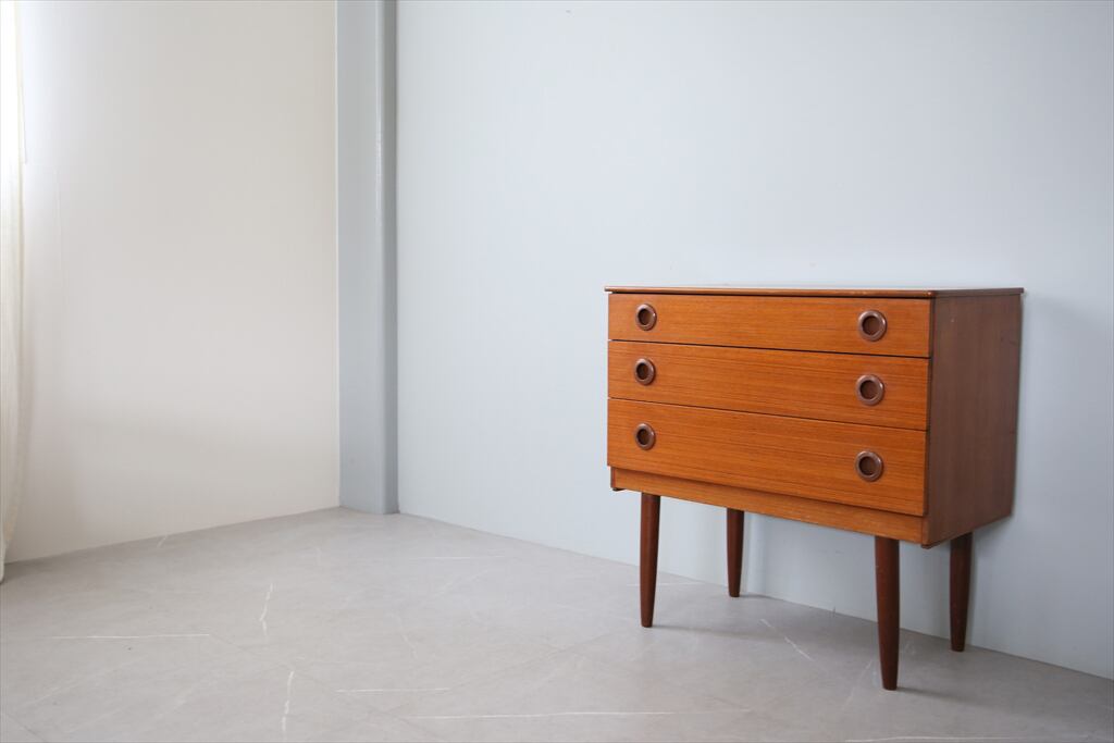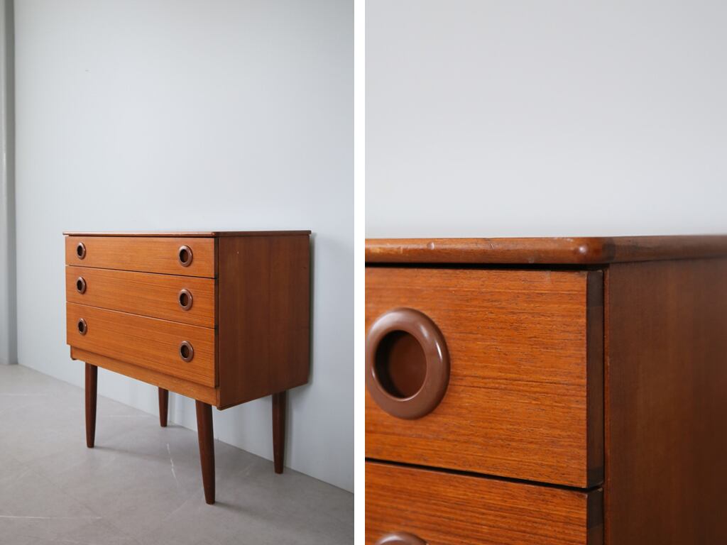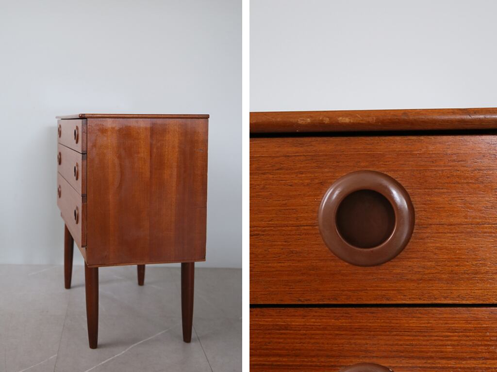 日本でも人気の高いチーク材のミッドセンチュリー家具は海外でも数が少なく希少です。こちらは状態も良く、人気の高い小ぶりなチェストですので、コレクターの方はもちろん、ミッドセンチュリー家具の好きな方にもお勧めです。自宅の北欧家具やミッドセンチュリーテイストの空間とも自然に馴染んでくれそう。