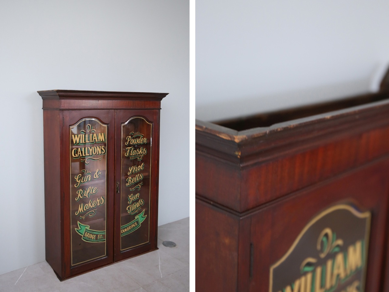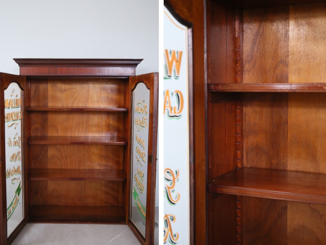 以前、イギリスの田舎のショップで、ディスプレイ棚として活躍していたこちらのキャビネット。ポップな字体の英字が異国情緒を漂わせます。