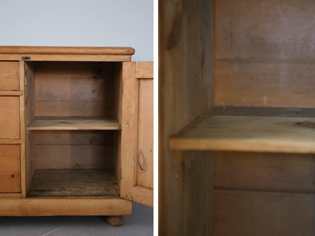 古いサイドボートは大切なコレクションの収納用としてはもちろん、食器棚としてやテレビ台としてなど家庭でも大活躍。お部屋のアクセントとしてや店舗什器としてもぴったりな一品です。経年の割りには状態も良くしっかりとした作りとなっています。