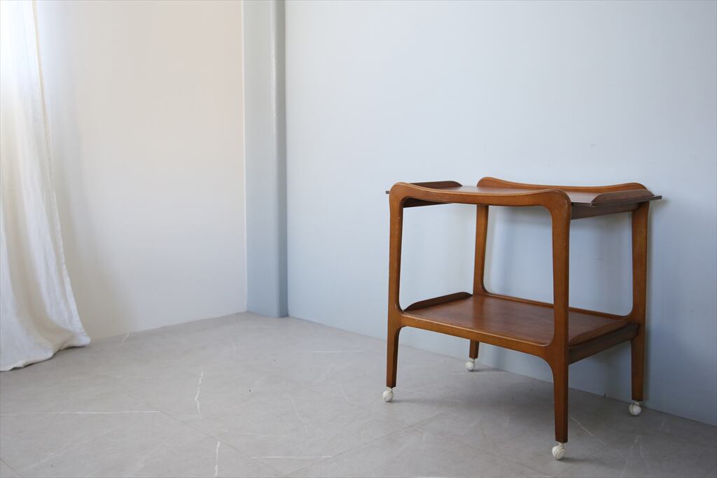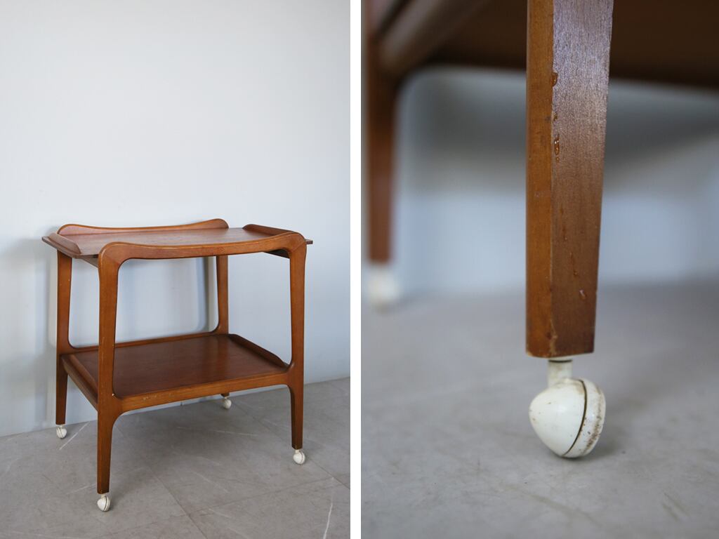 日本でも人気の高いチーク材のミッドセンチュリー家具は海外でも数が少なく希少です。こちらは珍しいトロリーテーブルですので、コレクターの方はもちろん、ミッドセンチュリー家具の好きな方にもお勧めです。自宅の北欧家具やミッドセンチュリーテイストの空間とも自然に馴染んでくれそう。