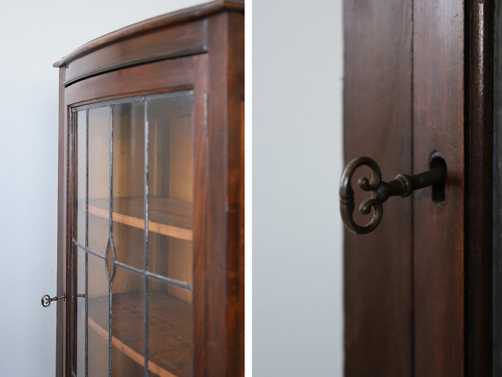 古い木製ガラスキャビネットは大切なコレクションの収納用としてや、プレートやカトラリーの飾り棚として活躍してくれそうです。お部屋のアクセントとしてや店舗什器としてもぴったりな一品です。