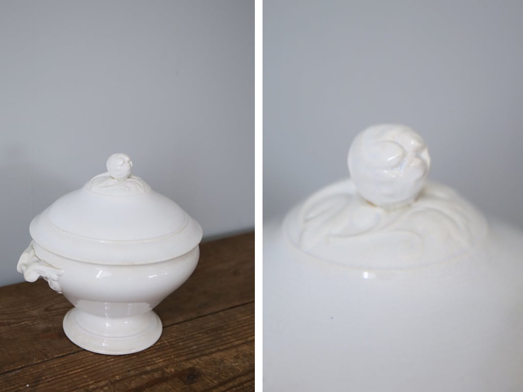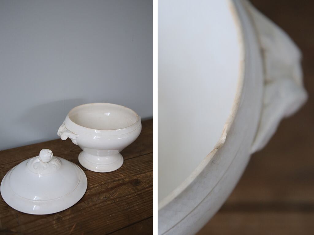 全体的に状態もよく蓋付きのディゴワンのスーピエールは、希少性も高く非常に貴重な一品です。白い肌に刻まれた貫入やシミも経年を過ごしてきた証。