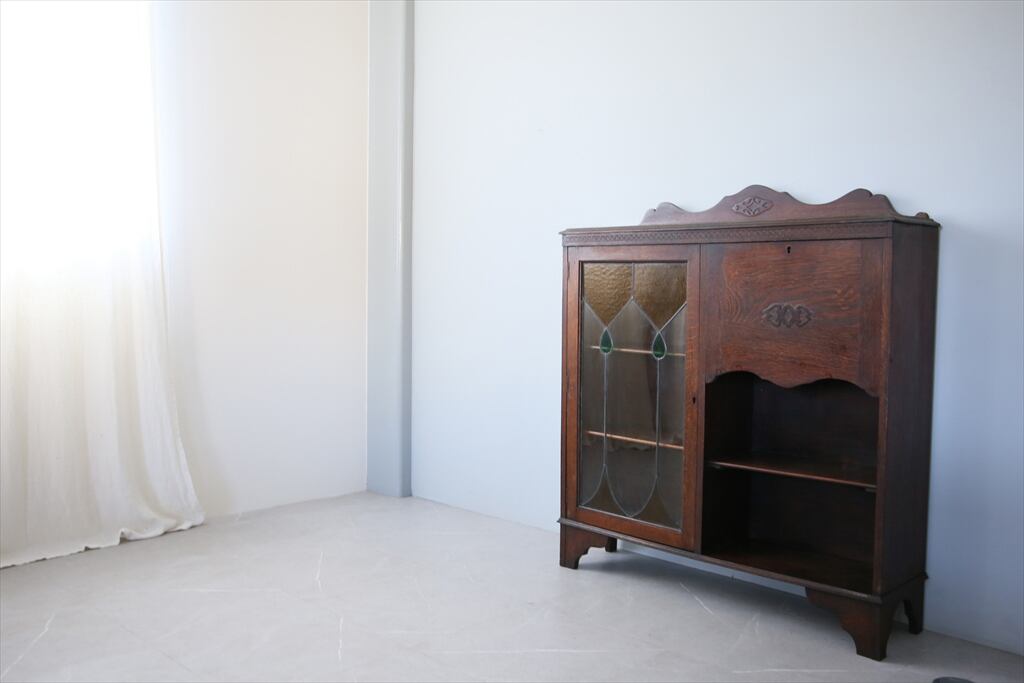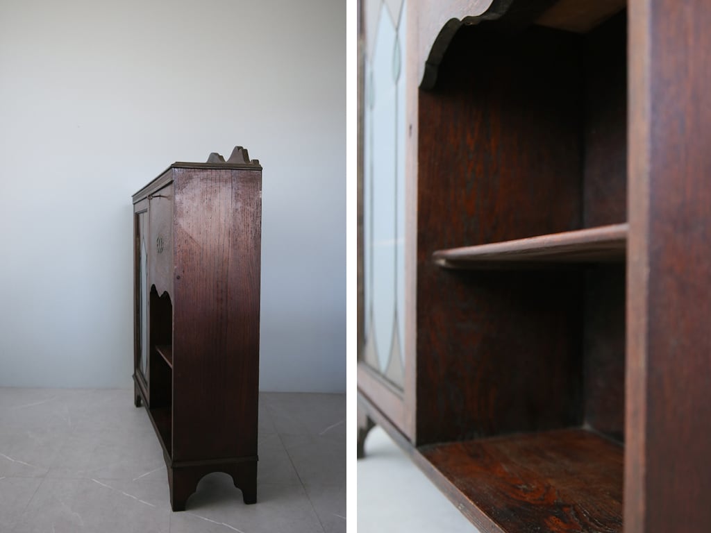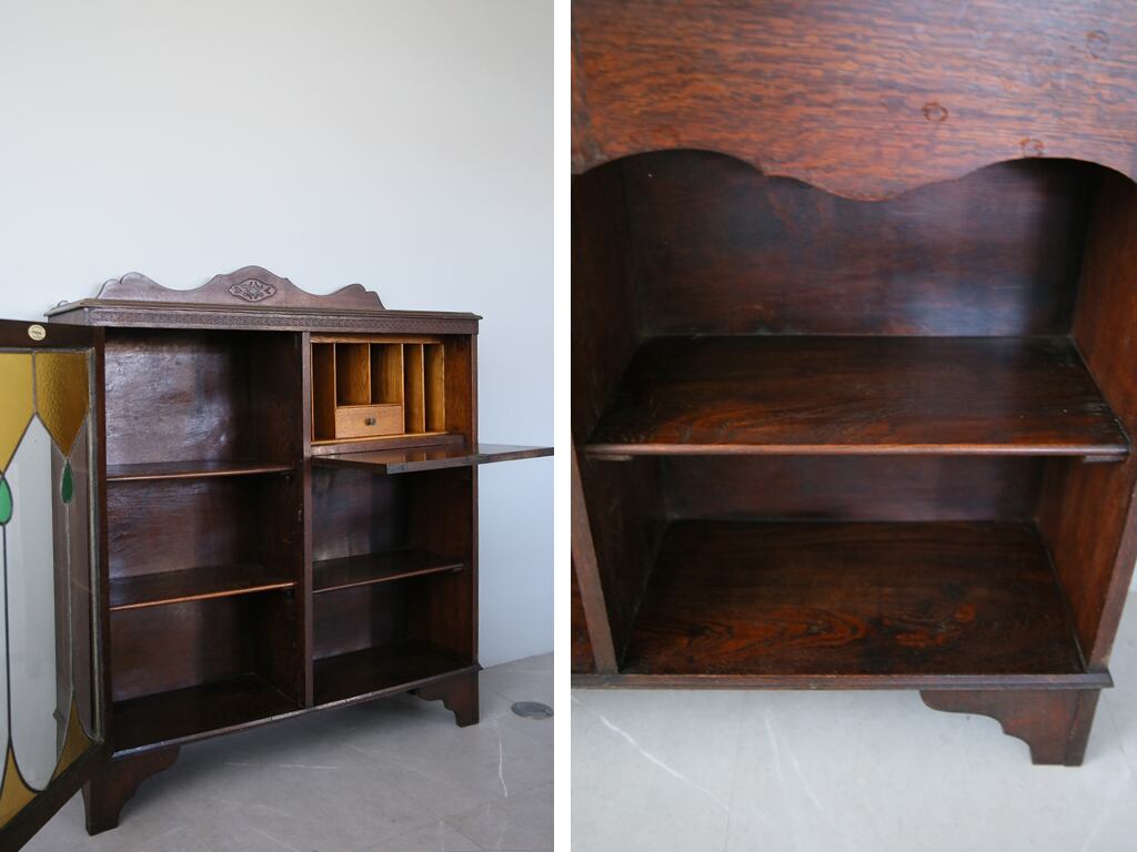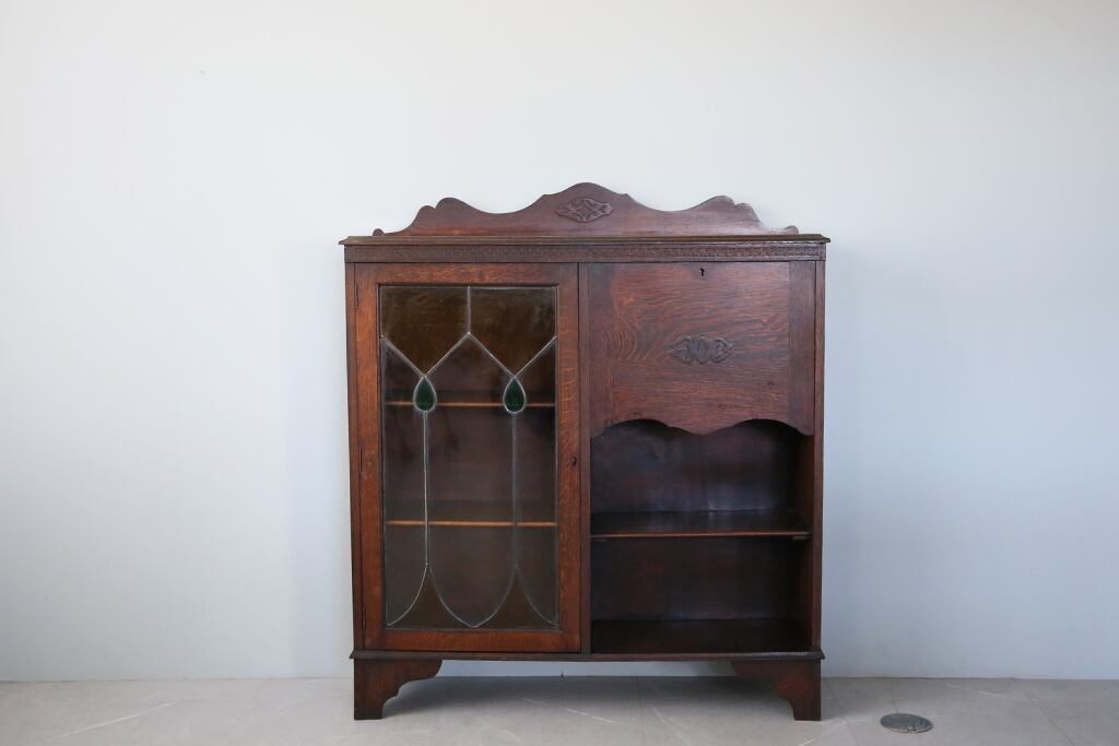 また、こちらはビューローの横にブックケース(本棚)が付いた存在感溢れる一品。古い木製キャビネットは大切なコレクションの収納用としてや、プレートやカトラリーの飾り棚としても活躍してくれそうです。扉のステンドグラスも異国情緒溢れる雰囲気です。