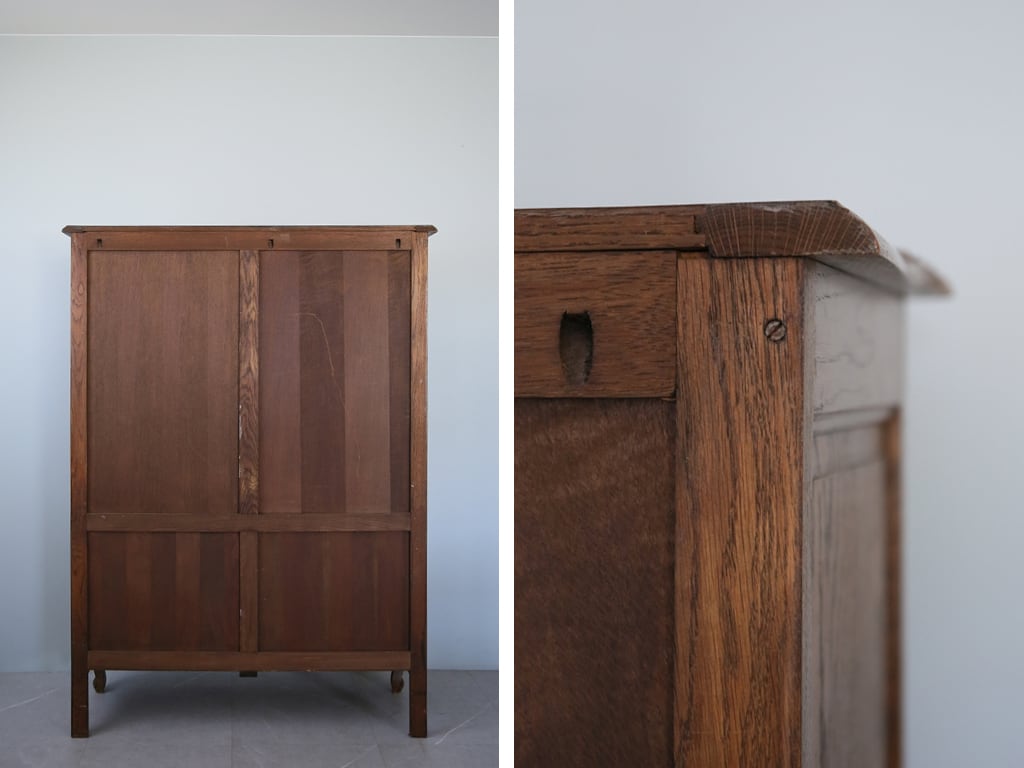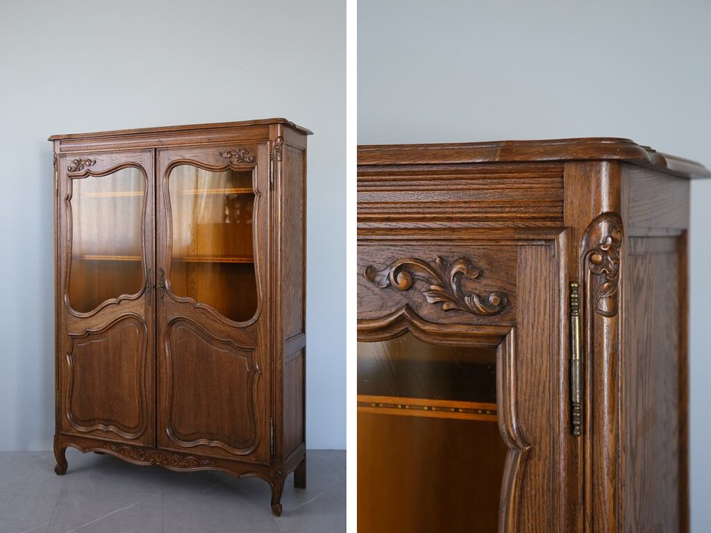 古い木製ガラスキャビネットは大切なコレクションの収納用としてや、プレートやカトラリーの飾り棚としても活躍してくれそうです。お部屋のアクセントとしてはもちろん、店舗什器としてもぴったりな一品ですね。