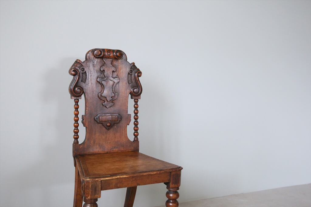 ホールチェアとは、もともと「玄関に置くため」だけに作られた椅子のため、背もたれや脚の装飾も美しく華やかであることが特徴的です。「座るため」に作られたのではなく「飾るために作られた」椅子。英国の上流階級の家庭で大切にされてきた椅子は異国情緒漂う雰囲気です。