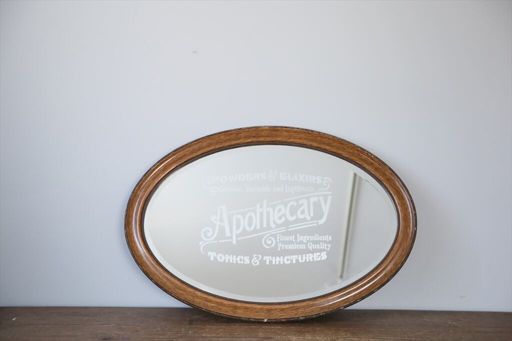 イギリスの田舎で見つけたオーバルフレームの古木カッティングミラー(ベベルドミラー)です。